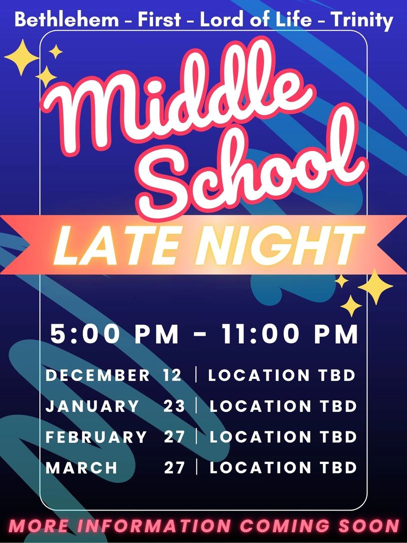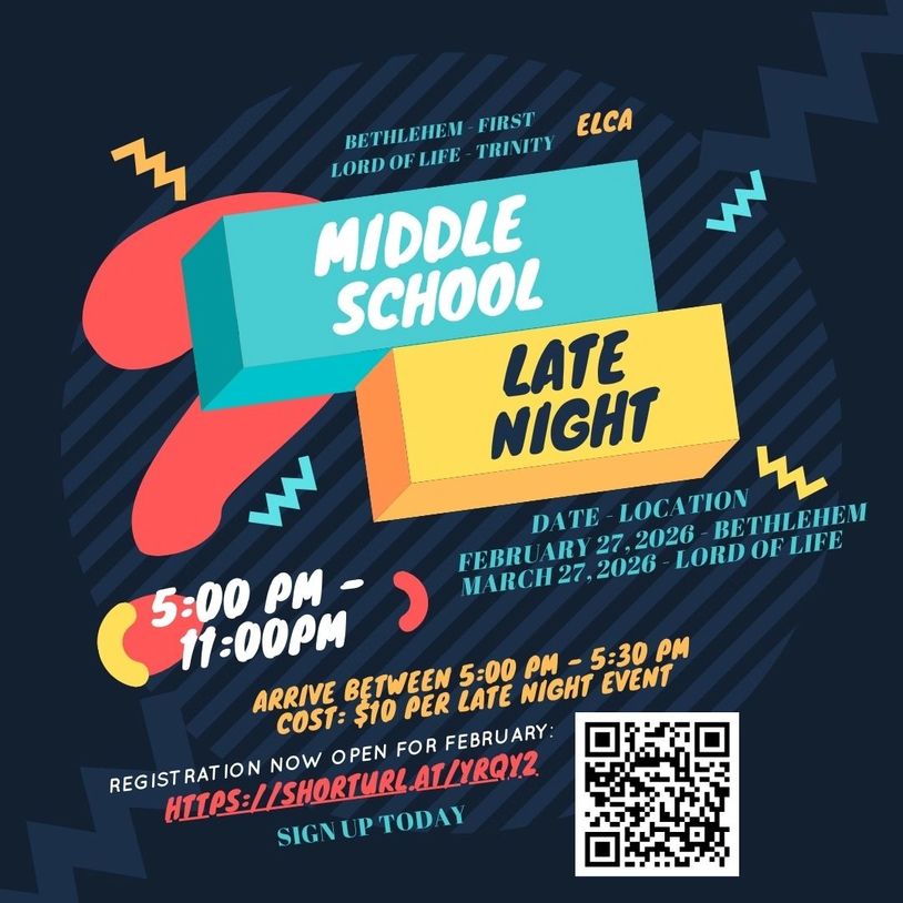 Join Middle School Youth from Bethlehem, First Lutheran, Lord of Life and Trinity.
